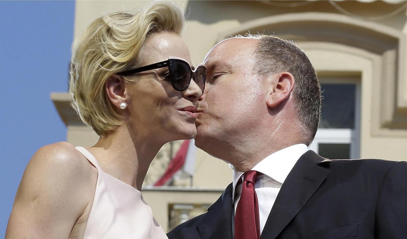 Prince Albert II of Monaco and Princess Charlene of Monaco embrace at Monaco's Palace during celebrations to mark Prince Albert II's decade on the throne, on June 11, 2015 in Monaco. REUTERS/Valery Hache/Pool