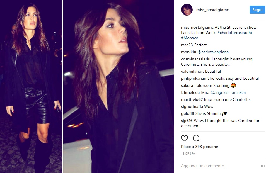 PARIGI – Charlotte Casiraghi: camicia vedo non vedo e shorts di pelle FOTO. Rock princess! Charlotte Casiraghi è apparsa super glamour in occasione della sfilata Saint Laurent SS 2018 che ha avuto luogo a Parigi nelle ore scorse. La figlia di Carolina di Monaco, 31 anni, ha scelto un outfit perfetto per il carattere punk chic della firma francese: camicia nera trasparente, shorts in pelle e stivali morbidi con tacco alto, Charlotte ha abbinato un soprabito maxi, in linea con la moda del momento. Che dire, come sempre la principessa è apparsa fashion e super glamour a dimostrazione del fatto che in quanto a look non sbaglia davvero un colpo.