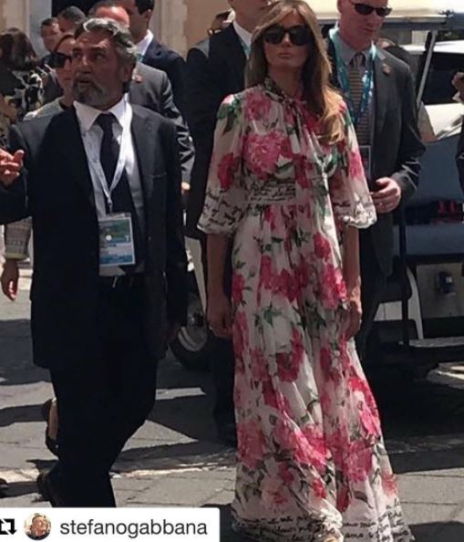Charlotte sembrerebbe essersi ispirata alla first lady americana Melania Trump, che durante il suo soggiorno in Italia in occasione del G7 ha indossato tutti abiti di Dolce e Gabbana. Un omaggio alla Sicilia e alla moda italiana nella sua prima giornata a Taormina è stato il vistoso soprabito floreale tridimensionale disegnato da D&G. Appariscente e coloratissimo, il prezioso soprabito ha un prezzo da capogiro: ben 51.500 dollari. Meno costosa, si fa per dire, la pochette coordinata sempre D&G, 1.630 euro. Non è la prima volta che Melania Trump sceglie gli stilisti siculo-milanesi in questo primo viaggio all’estero al seguito del marito. Era Dolce e Gabbana anche il tubino in pizzo nero scelto per l’incontro con papa Francesco.