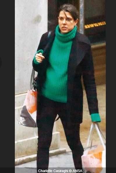 Nelle foto pubblicate da Gente la nipote di Grace Kelly indossa un maglione verde sotto il quale si intravede il pancino. Effettivamente anche al Ballo della Rosa aveva optato per un outfit tattico. La sua ingombrante stola Saint Laurent le copriva la pancia e ora forse si capisce il perché di quel tipo di look.