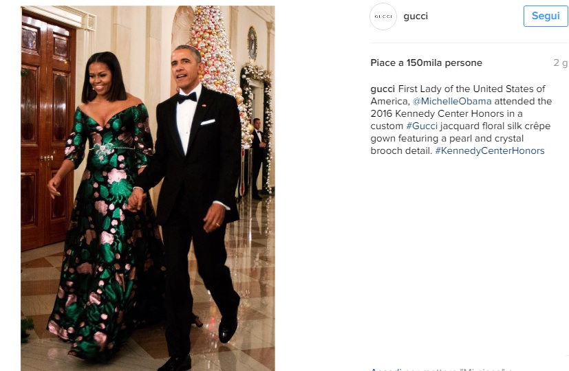 Questa settimana è stata però Michelle Obama, ex first lady d’America, a far parlare di sé per il suo abito Gucci. Per la prima volta in otto anni la moglie di Barack Obama non ha indossato un abito americano in occasione dell’evento culturale dell’anno di Washington, il Kennedy Center Honors. Michelle ha optato per un abito italiano, firmato proprio Gucci. Una scelta che non è passata inosservata negli Stati Uniti e che per il New York Times è vista come un simbolo di solidarietà e sostegno della Casa Bianca nei confronti del premier Renzi, subito dopo la vittoria del “no” al referendum costituzionale e le sue dimissioni. Per l’ultima State dinner della presidenza Obama, quest’ultimo aveva invitato proprio Matteo Renzi e signora. Una scelta che ha testimoniato la grande intesa tra i due leader. Non è da escludere perciò che Michelle abbia optato per Gucci, casa di moda fondata da Guccio Gucci nel 1921 a Firenze, città di cui l’ex premier è stato sindaco. Di seguito una gallery con le foto delle tre donne in outfit Gucci.