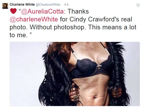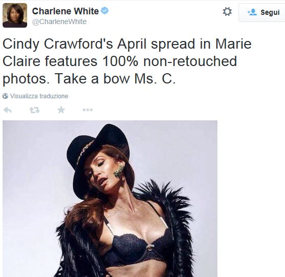 LONDRA – Cindy Crawford, smagliature e cellulite su Marie Claire, 100% naturale. L’ex top model comparirà così, senza photoshop, sul numero di aprile della rivista femminile. Su Twitter circola uno scatto senza ritocchi della modella statunitense, che il 20 febbraio compirà 49 anni. E’ stata pubblicata da Charlene White, giornalista televisiva britannica. “Cindy Crawford 100% non ritoccata sul numero di aprile di Marie Claire. Fatele un inchino!”, queste le parole della White in un tweet. Nella foto Cindy mostra la sua pancia in cui sono visibili i segni del tempo, smagliature in primis. Indossa un completo intimo e uno spolverino di pelo sintetico sopra. Alla faccia dei ritocchini!