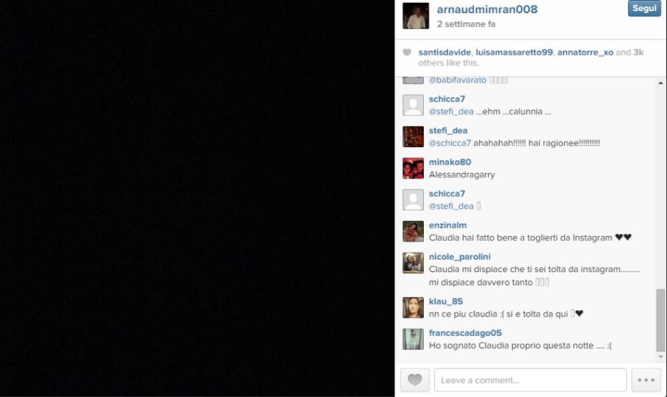 In assenza della pagina ufficiale di Claudia, molti fan si sono riversati su quella instagram di Arnaud, scrivendo commenti d’affetto del tipo: “Claudia mi dispiace che ti sei tolta da instagram……… mi dispiace davvero tanto”, “Claudia hai fatto bene a toglierti da Instagram”, “torna su instagram fallo per i tuoi fan che ti vogliono bene gli altri bloccali, vi abbraccio”.