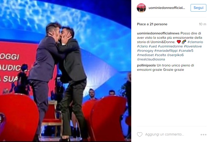 ROMA – Claudio Sona ha scelto Mario: bacio sfiorato tra i due FOTO. Dopo circa 3 mesi di trono il primo tronista gay della storia di Uomini e Donne ha fatto la sua scelta: si tratta del corteggiatore Mario Serpa. Un po’ di delusione si è percepita sui Social da parte dei fan del trono gay in quanto subito dopo la scelta i due si sono dati un velocissimo e sfioratissimo bacio a stampo. Nullo di eclatante dunque e, in molti, si sono chiesti se sia stata una decisione presa dai vertici del programma o da Claudio e Mario stessi.