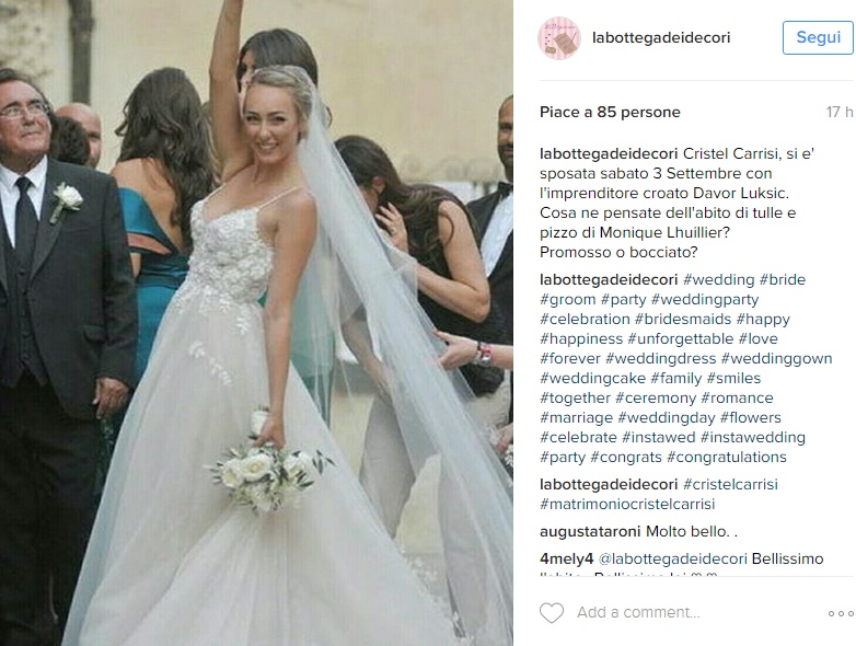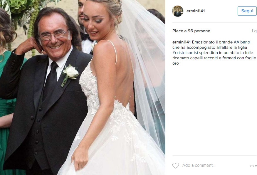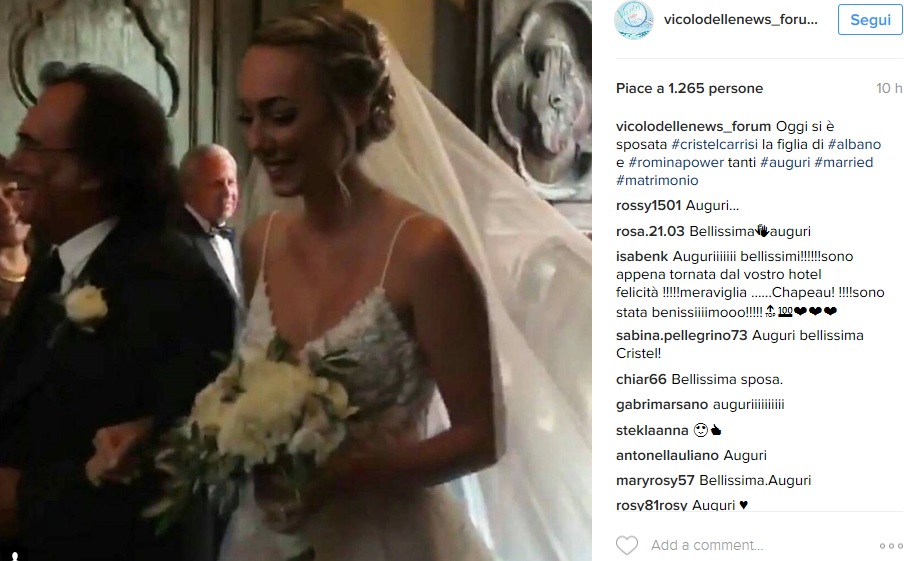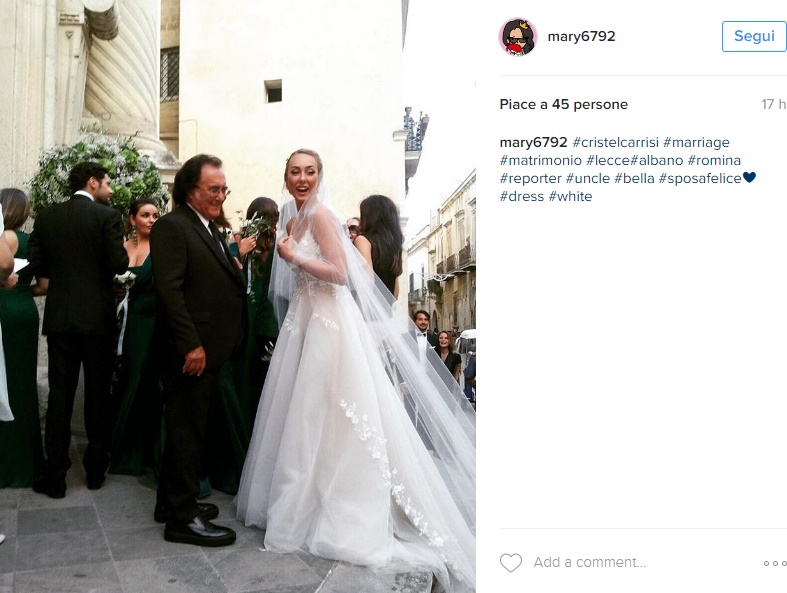 Non è passata inosservata la sorella di Cristel Carrisi, Romina Carrisi, che per la cerimonia ha scelto un abito lungo, verde e aderente abito su misura della SARTORIA CORDELLA COUTURE, realizzato da Pino, Carol e Manuel Cordella. Un modello che metteva in risalto la bellezza della giovane, che assomiglia molto alla mamma, Romina Power. Quest’ultima ha invece optato per un elegante abito rosso modello kaftano firmato Laura Biagiotti.