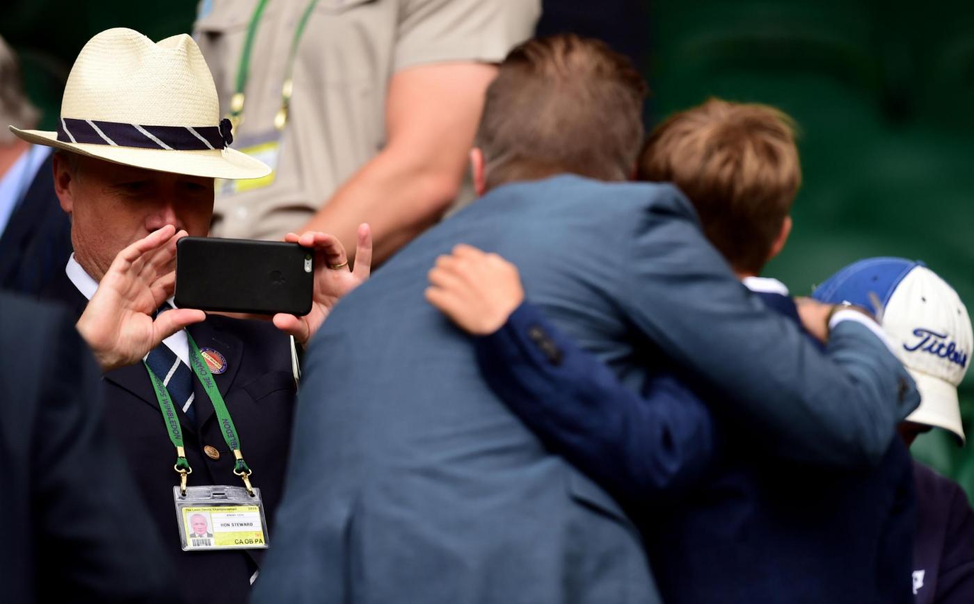 An honorary steward takes a picture of David Beckham and his son Romeo during day Nine of the Wimbledon Championships at the All England Lawn Tennis and Croquet Club, Wimbledon. PRESS ASSOCIATION Photo. Picture date: Wednesday July 8, 2015. See PA Story TENNIS Wimbledon. Photo credit should read: Dominic Lipinski/PA Wire. RESTRICTIONS: Editorial use only. No commercial use without prior written consent of the AELTC. Still image use only - no moving images to emulate broadcast. No superimposing or removal of sponsor/ad logos. Call +44 (0)1158 447447 for further information. Lapresse Only italyDavid Beckham e figlio Romeo assistono in tribuna al Torneo di Wimbledon