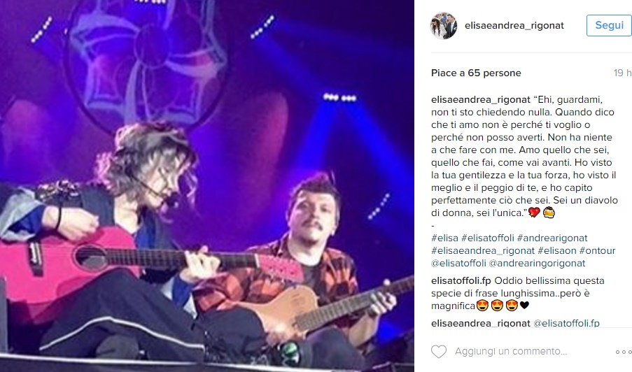 Per quanto riguarda la sua vita privata, Elisa è sposata dal 5 settembre 2015 con Andrea Rigonat -chitarrista della band con cui canta la Toffoli- fidanzato storico della cantante. Classe ’76, Andrea ha 40 anni ed è nato a Gorizia. Lui ed Elisa si sono conosciuti sul palco molti anni fa e da allora non si sono più lasciati. In occasione del matrimonio lei ha indossato un abito firmato Alberta Ferretti. Elisa e Andrea hanno 2 figli: Emma Cecile, nata il 22 ottobre 2009, e Sebastian, nato il 20 maggio 2013. In una intervista a IoDonna, Elisa ha raccontato: