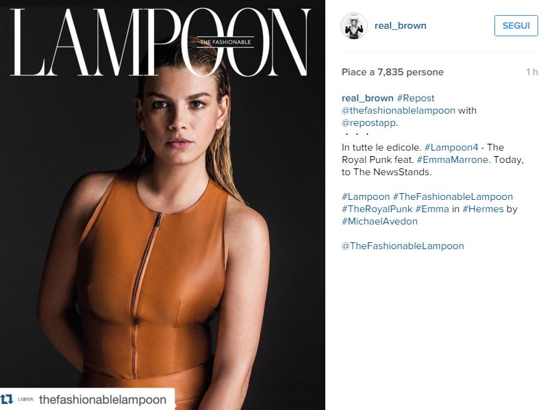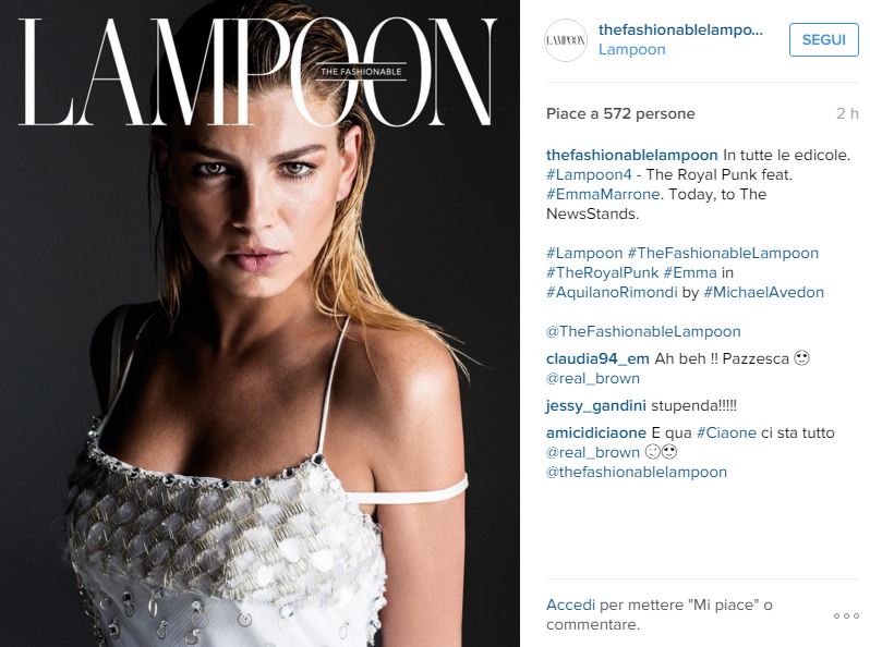 Emma Marrone sensuale sulla cover di Lampoon, magazine indipendente di moda particolarmente caro alla cantante, che lo scorso dicembre aveva anche partecipato al party organizzato dalla rivista a Milano. L’artista, 31 anni, ha postato le foto del servizio fotografico sul suo profilo Instagram. Una serie di scatti in cui Emma di mostra con vari outfit e al fianco del modello Baptiste Giabiconi. In questi ultimi mesi la Marrone ha avuto una vera e propria svolta fashion, merito anche degli stilisti cui si affida per essere impeccabile