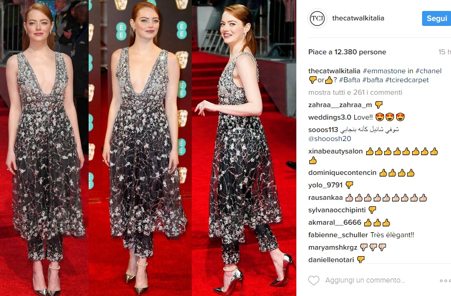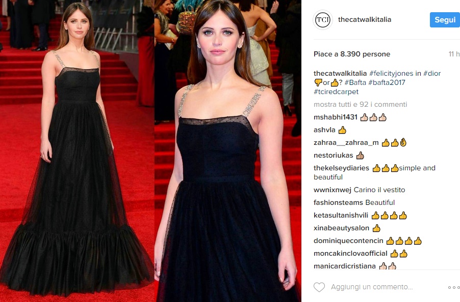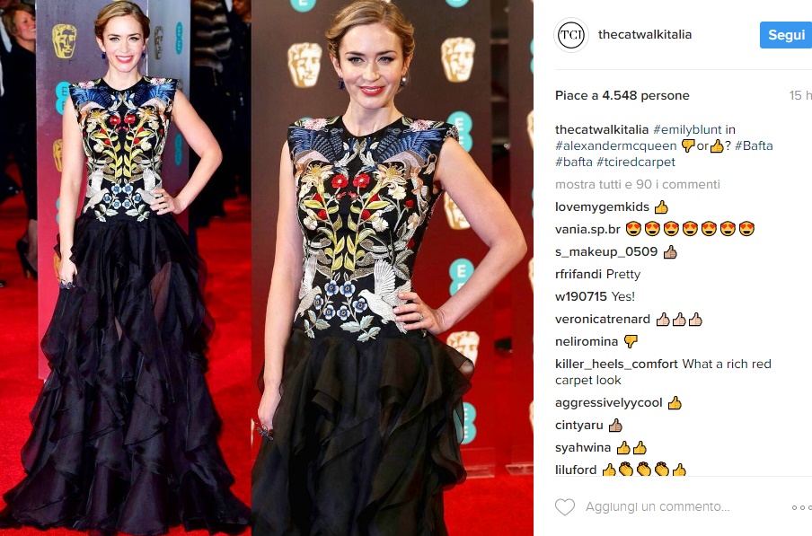 Regina del red carpet è stata senza dubbio Kate Middleton, moglie del principe William, che ha catalizzato l’attenzione dei fotografi con un abito lungo con stampe a fiori firmato Alexander McQueen. Occhi puntati anche su Emma Stone, anche lei protagonista assoluta dei BAFTA grazie al film La La Land di cui è protagonista insieme a Ryan Gosling. Per l’occasione l’attrice ha sfoggiato un completo Chanel formato da abito e pantaloni che le stava divinamente. Abito verde acceso per Amy Adams, in nomination come migliore attrice per il film Arrivals, che ha scelto una creazione con profili in velluto firmata Tom Ford. Eterea la super modella Taylor Hill in un abito bianco Alexander Wang che lasciava scoperta la schiena mentre più sacrificata la stella nascente Anya Taylor-Joy, attrice rivelazione del film Split, che ha sfoggiato un abito lungo e a balze firmato Gucci. Bellissima Emily Blunt con un abito lungo con rouges morbide e corpetto rigido con fantasia simmetrica firmato Alexander McQueen. Vestitino corto in argento per Michelle Williams in Louis Vuitton mentre Nicole Kidman, meravigliosa, ha sfoggiato la bellezza senza tempo di un abito lungo a sirena con schiena scoperta Armani Privè. Abito lungo in maglina Atelier Versace per Penelope Cruz, mentre la bella Felicty Jones ha calcato il red carpet con un abito lungo nero in tulle della collezione di Maria Grazia Chiuri per Dior.
