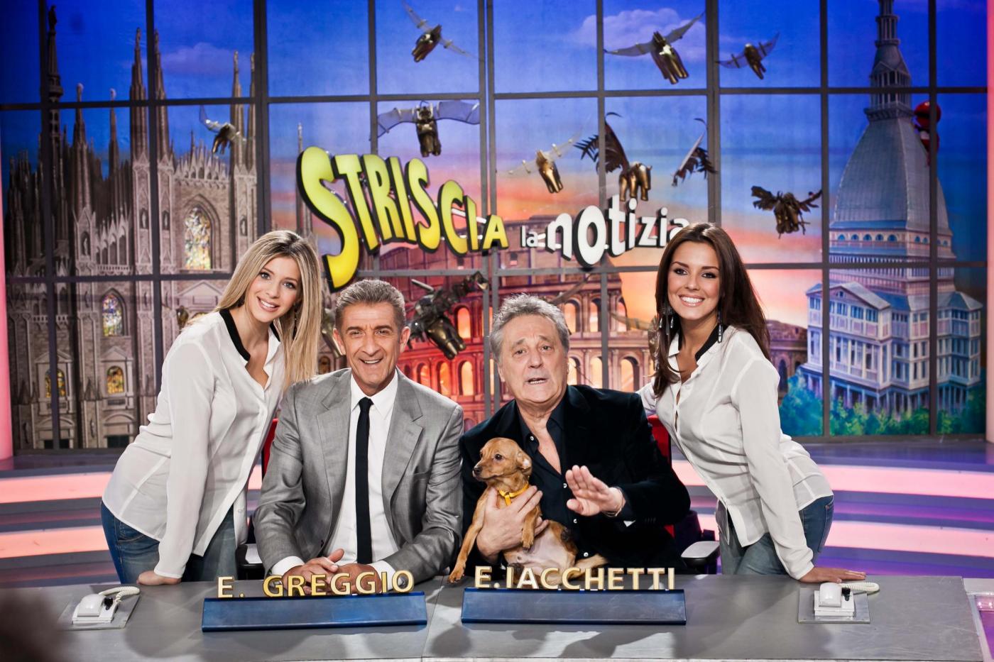 LaPresse Segrate 07/01/13 Striscia la notizia, Enzo Iacchetti torna al fianco di Ezio Greggio Nella foto: Ezio Greggio, Enzo iachetti, le veline Alessia Reato e Giulia Calcaterra