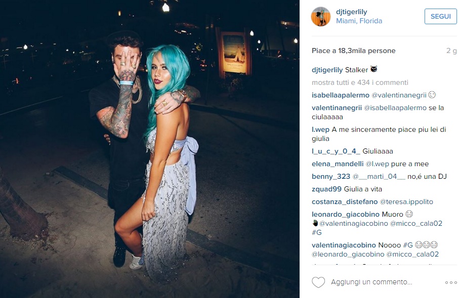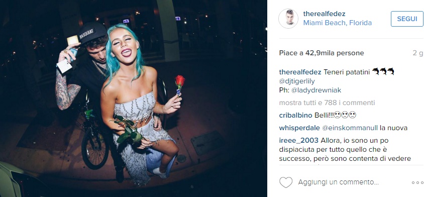 “«Ehi Lily, sono in città! Possiamo limonare? (Aiutatemi a retwittare così magari si accorge», ha scritto il rapper appena sbarcato in Florida per chiederle un «appuntamento». La sua risposta? «Forse». Per la gioia dei quasi 2 milioni di follower del cantante. E ancora: «L’altra sera era da Tiesto e Hardwell, sono arrivato un minuto dopo che lei se n’è andata. Oggi con la macchina esco dal mio hotel per andare all’altro hotel, la becco al semaforo e le faccio ‘Hey, Tiger‘. E lei di tutta risposta…nulla». Poi, però, sul profilo Instagram del rapper, tra una foto dei tatuaggi e una di un party, sono apparsi i primi scatti insieme.Fedez al fianco di una molto sorridente TigerLily che, ironicamente, lo definisce «stalker». I due hanno trascorso la serata insieme, in compagnia di alcuni amici. E il rapper da «vero romanticone» l’ha omaggiata con tanto di rose rosse. Lei sembra aver gradito. E a quanto pare «la coppia» avrebbe lasciato il locale nello stesso momento”.