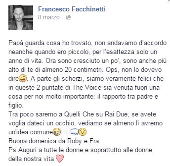 MILANO – Francesco Facchinetti a 1 anno, foto-dedica al padre Roby. Il giudice di The Voice Italia ha postato sul suo profilo Facebook una foto che lo ritrae a 12 mesi tra le braccia del papà. Lo scatto è accompagnato da una tenera dedica nei confronti di Roby, cantante dei Pooh e anche lui giudice del talent show. “Papà guarda cosa ho trovato – scrive Francesco – non andavamo d’accordo neanche quando ero piccolo, per l’esattezza solo un anno di vita. Ora sono cresciuto un po’, sono anche più alto di te di almeno 20 centimetri. Ops, non lo dovevo dire”.