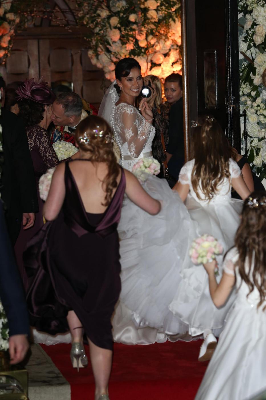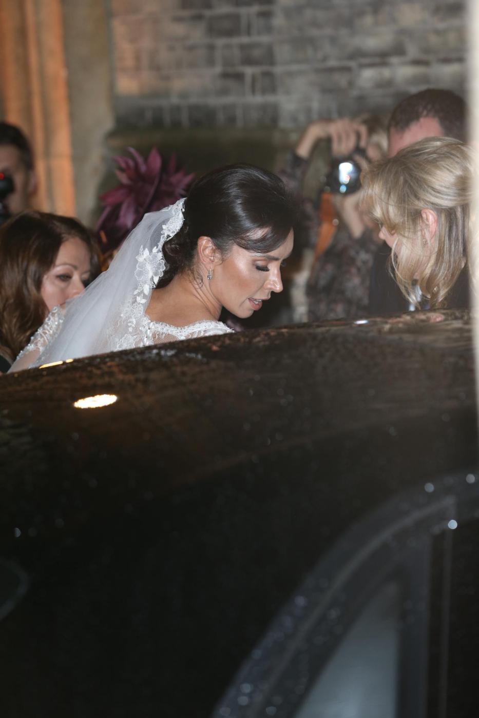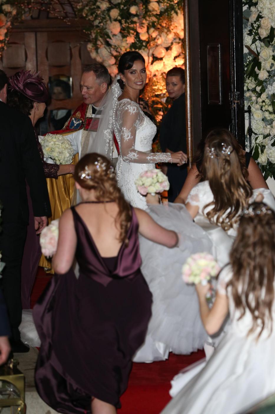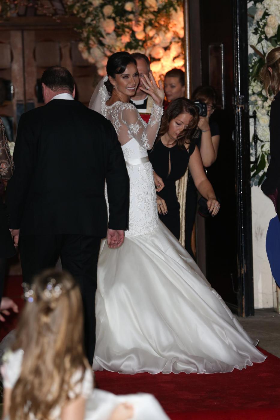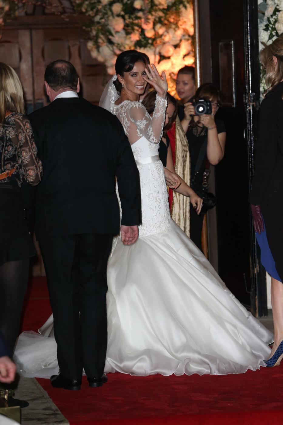 Tutti gli occhi però non potevano che essere per lei, la sposa, raggiante in un abito bianco molto scollato, con maniche in pizzo e lungo fino ai piedi, firmato Suzanne Neville, dal costo di diecimila sterline. Al momento dei saluti i due sposi, con il sorriso sulle labbra, hanno brindato, mostrato le fedi nuziali e si sono baciati.