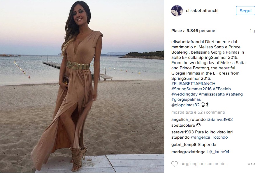 ROMA – Giorgia Palmas, nozze Melissa Satta in Elisabetta Franchi FOTO. Meravigliosa Giorgia Palmas con un abito da sogno firmato Elisabetta Franchi. La showgirl si è presentata al matrimonio dell’amica Melissa con un look da sogno. Si trattava di un abito lungo della collezione primavera/estate 2016 color rosa antico con un profondo spacco che metteva in risalto le gambe lunghe e toniche della Palmas, una cintura dorata e intrecciata in vita che donava moltissimo al vitino da vespa della showgirl e una scollatura mozzafiato.
