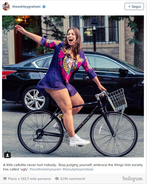 ROMA – Ashley Graham, modella curvy orgogliosa della propria cellulit. Ashley Graham appare bella e sorridente in sella a una bici. La modella americana divenuta famosa dopo aver posato per Sport illustrated Swinsuit, mostra senza pudore le sue gambe che non nascondono di certo la cellulite. Ashley ha postato questo nuovo scatto su Instagram per così continuare la sua battaglia verso l’accettazione di se stessi e del proprio corpo, anche quando si esce dai canoni rigidi imposti dalle riviste patinate.