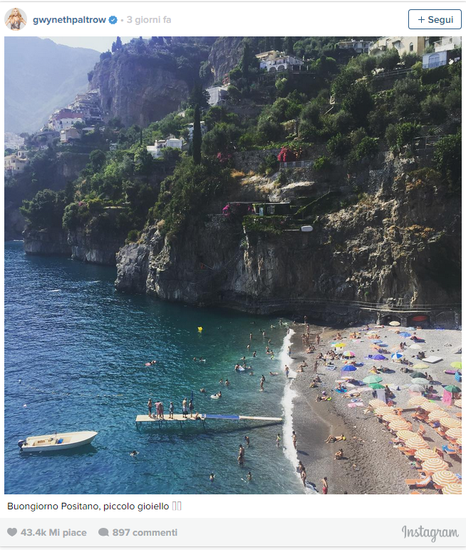 A42 anni, l’attrice di “Sliding Doors” dice ancora la sua con un fisico snello al punto giusto. Ad annunciare il viaggio a Positano è stata proprio la bionda attrice che ha scritto ai suoi followers definendo la località campana un “piccolo gioiello”. Gwyneth ha lasciato a casa i suoi figli – Apple, 10 anni, e Moses, 8 avuti dall’ex marito Chris Martin, leader di Coldplay – ed è andata al mare col nuovo fidanzato Brad Falchuk, 44 anni, autore e produttore del fortunatissimo “Glee”. Dopo la spiaggia, come raccontano i siti locali, la bella attrice ha gustato piatti a base di pesce nei ristoranti più famosi, camminando per Positano a piedi scalzi come una qualunque turista. A seguire le foto postate su Instagram dalla Paltrow, che annunciano il viaggio a Positano ed una bella abbuffata di pasta, che l’attrice si è concessa prima di lasciare Roma.