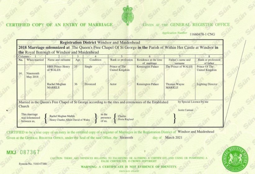 Il certificato è stato fornito dall’Ufficio del Registro Generale e reso noto dal tabloid The Sun.