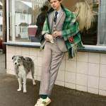 Harry Styles è ritratto in una serie di abiti di sartoria Gucci, fra cui due completi con cappotto (uno in lana mohair pied de poule bianco-rosso-nero indossato con una stola verde a scacchi, l’altro in tessuto grigio scuro con api), una vestaglia in tessuno zigrino a quadretti grandi splash-dark e beige usata come soprabito, una giacca in lana mohair scura con revers ricamati, e una giacca in tessuto occhio di pernice di lana in sfumature di bianco e beige chiaro con patch MLB NY Yankees. Lo styling è contemporaneo, con abiti di taglio sartoriale accoppiati a camicie e cravatte formali, camicie casual con bottoniera, e mocassini, sandali e sneaker. FOTO ANSA.