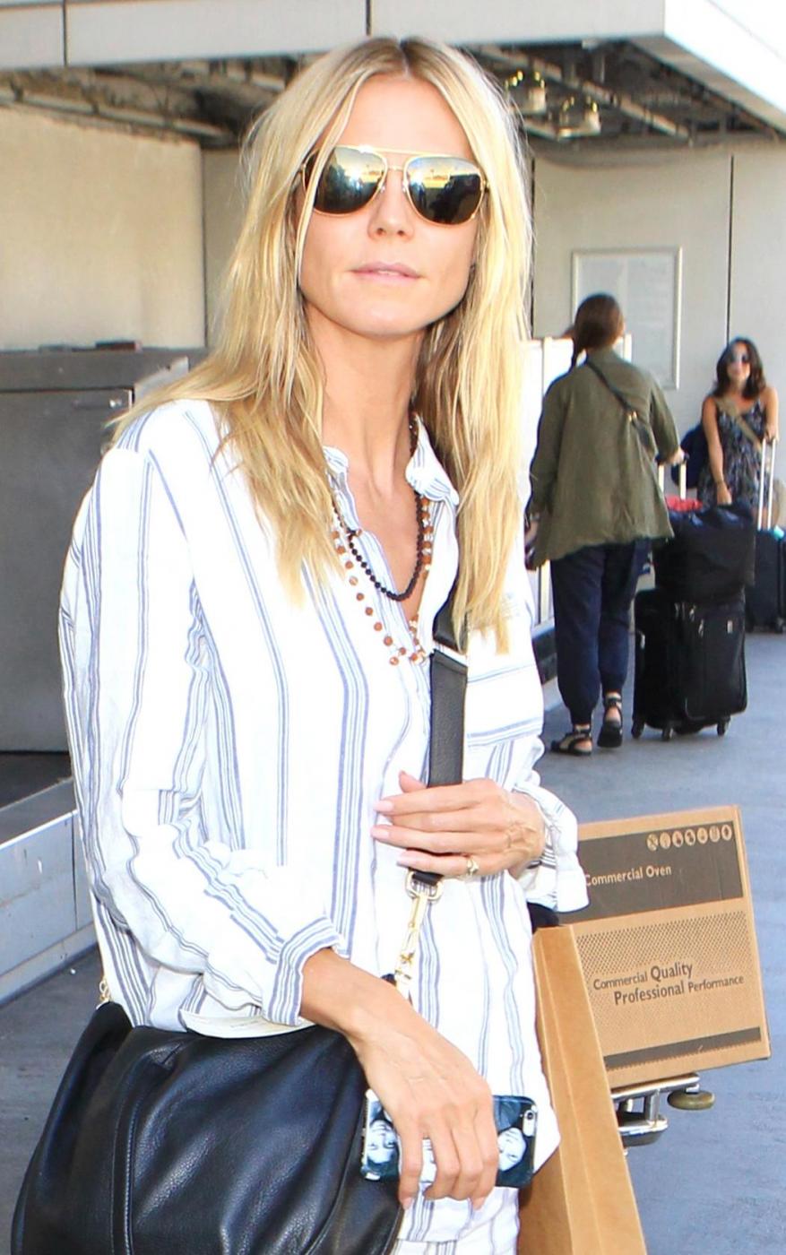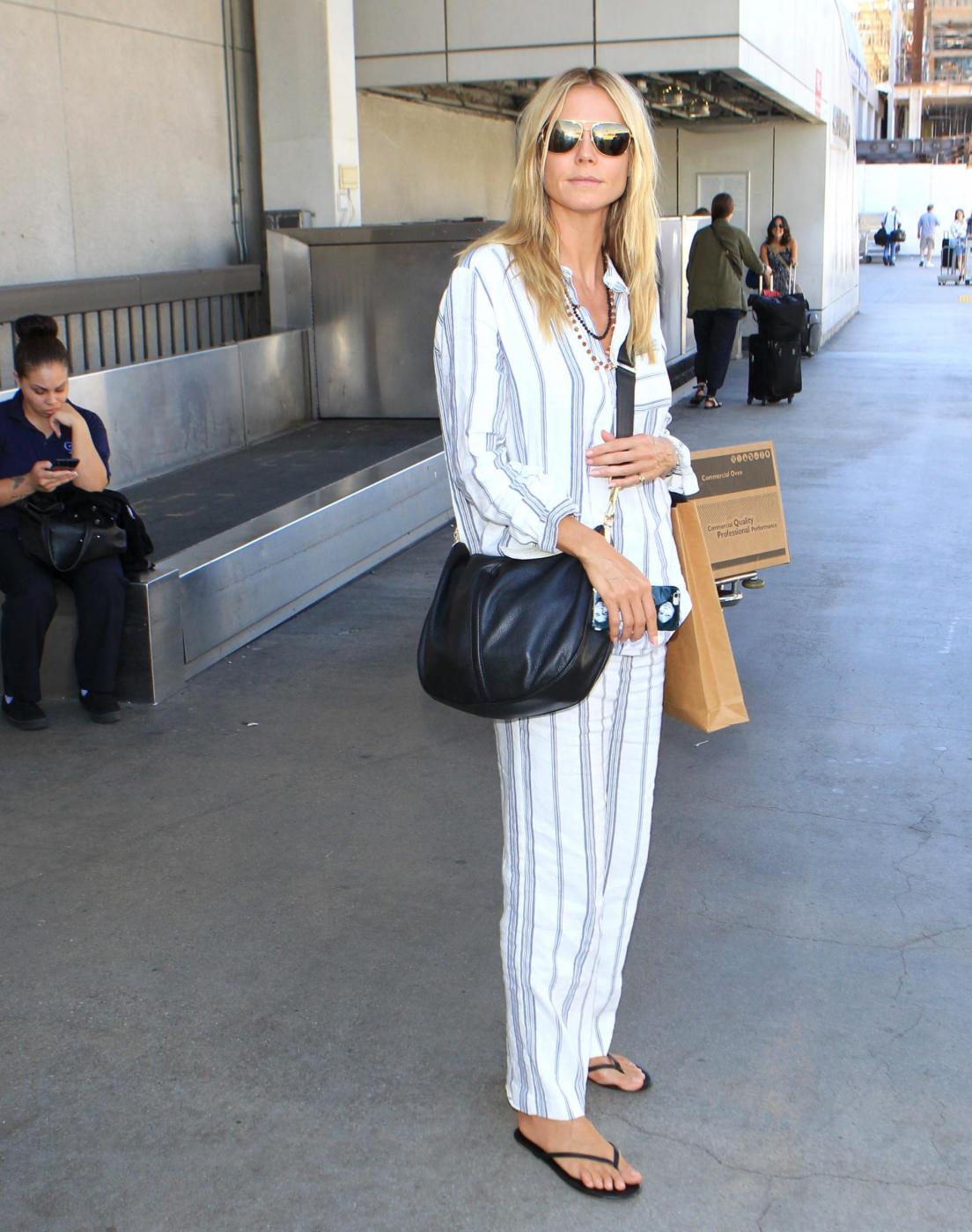 LOS ANGELES – Heidi Klum, “pigiama” e infradito… ma è sempre chic! Può riuscirci solo lei: indossare un completo a righe che assomiglia molto ad un pigiama, flip-flop ai piedi e apparire lo stesso super chic. Non c’è storia: in quanto ad eleganza Heidi Klum non deve prendere lezioni da nessuna. Paparazzata all’aeroporto di Los Angeles, l’ex super modella possiede una allure super chic e fashion con un completo blusa e pantaloni che farebbe impallidire chiunque. Borsa a tracolla come le ultime tendenze vogliono e maxi collane completano il look.