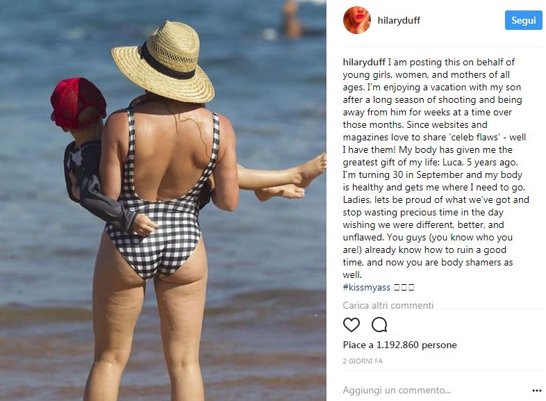 LOS ANGELES – Hilary Duff paladina della cellulite. La famosa attrice americana ha postato una foto su Instagram in cui si mostra di spalle mentre è al mare. Nello scatto Hilary è in bikini intero e si intravede qualche lieve segno di ritenzione idrica più che cellulite. Ma è innegabile che qualche piccola imperfezione ci sia. Dopo che qualche utente della rete ha criticato la splendida cantante, mamma di Luca Cruz Comrie, per la sua forma fisica, l’artista ha deciso di dire la sua con un lungo post su Instagram, che ha ottenuto più di un milione di “like”. Queste le parole di Hilary Duff, come si legge sul sito GingerGeneration :