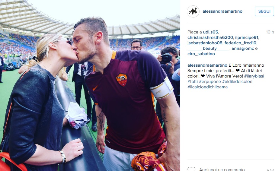 ROMA – Ilary Blasi: Francesco Totti, il bacio che scalda i tifosi FOTO. 600 partite in serie A, 600 successi. Francesco Totti festeggia l’ultima partita della stagione all’Olimpico con la sua Ilary in modo speciale: un bacio unico e appassionato che immediatamente mandato in visibilio i fan del capitano della Roma. Una festa incredibile quella di tutto lo Stadio per la leggenda della Roma che, nonostante le polemiche degli ultimi mesi, sa rendersi sempre necessario nella squadra. I giallorossi hanno infatti battuto il Chievo 3-0 e a fine gara il bacio di Totti alla moglie che ha scaldato i cuori di milioni di persone in tutta Italia.