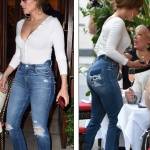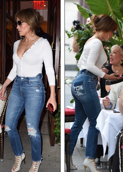La maglia è infilata all’interno di un paio di jeans denim stretti, portati a vita alta e strappati sulle ginocchia. Il jeans risalta le sue curve come sempre al top. Ai piedi, Jennifer indossa dei tacchi molto alti e con i lacci. La scarpa risalta il piede della star e richiama con il colore la maglia che indossa. Agli occhi un paio di occhiali da sole e sulle orecchie dei grandi orecchini dorati.