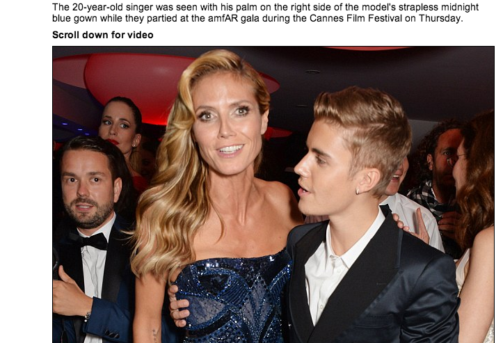 CANNES – “Justin Boober” titola il Daily Mail con un gioco di parole tra Bieber e “boob”, che in inglese vuol dire “seno”. Sì perchè sarà stata l’emozione di trovarsi a fianco di una delle modelle più famose al mondo, ma nella foto si vede il cantante canadese avvinghiare Heidi Klum con tale entusiasmo da lambire con la mano il seno della bellezza tedesca.