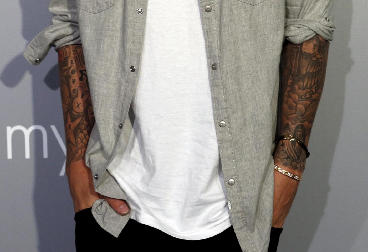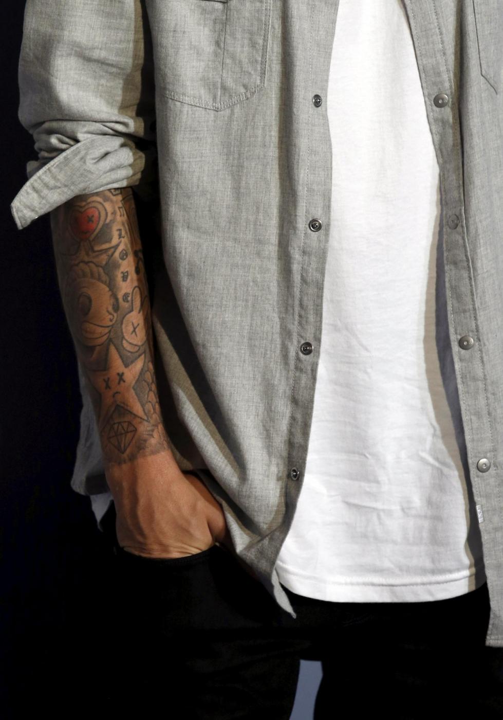 Tattoos are seen on the arms of Canadian singer, songwriter and actor Justin Bieber at a musical event hosted by Calvin Klein Jeans in Hong Kong, June 11, 2015. REUTERS/Bobby Yip