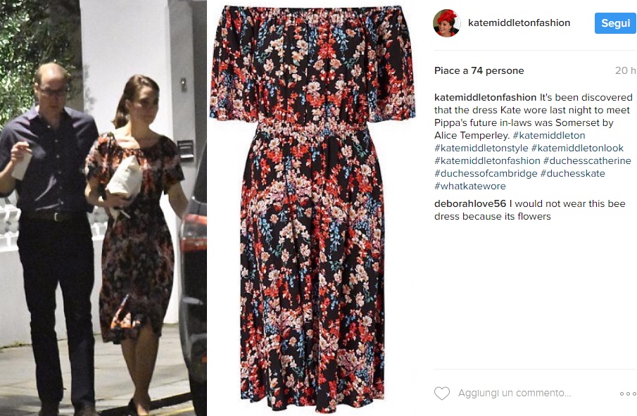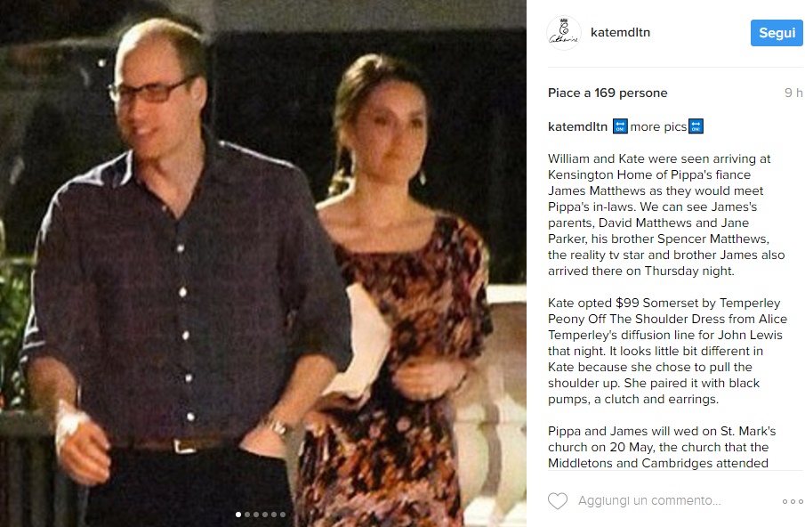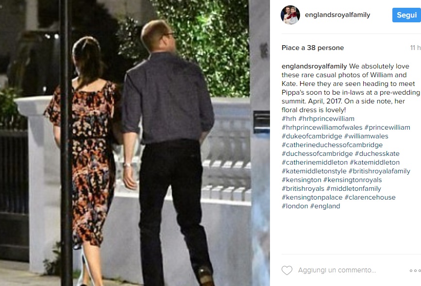 Kate e William sono stati paparazzati fuori dalla casa di Pippa ma il look della Duchessa ha deluso: per l’occasione ha scelto un abito a stampe floreali firmato Temperley London, lungo fino al ginocchio che però non rendeva giustizia alla bellezza e all’eleganza di Kate. Il Principe William, invece, ha scelto un look casual, optando per una camicia color navy senza cravatta e pantaloni neri.