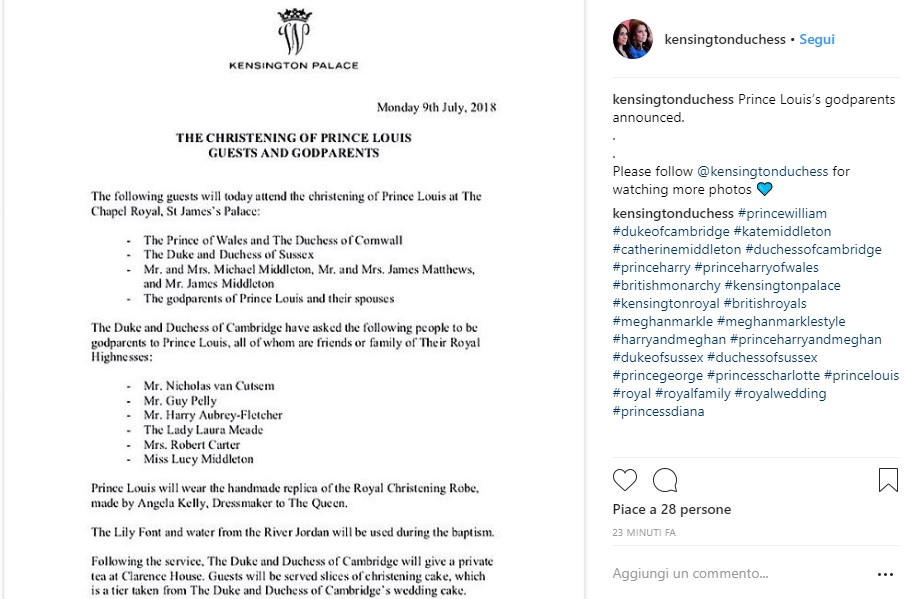 La coppia reale ha anche annunciato la lista degli invitati al battesimo, tra cui figurano il principe Carlo e la moglie Camilla e il duca e la duchessa del Sussex. I membri della famiglia di Kate Middleton presenti al battesimo saranno la madre Carole e il padre Michael Middleton, la sorellina Pippa insieme al marito James Matthews e il fratello James Middleton.