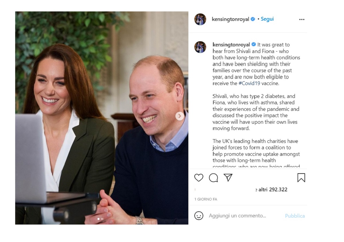 Kate Middleton e William hanno partecipato ad una diretta Zoom per parlare dell’implementazione del vaccino Covid-19. La campagna vaccinale nel Regno Unito procede veloce e spedita e nel frattempo Kate Middleton e William si stanno impegnando per far aumentare la consapevolezza dell’importanza del vaccino nella popolazione inglese.