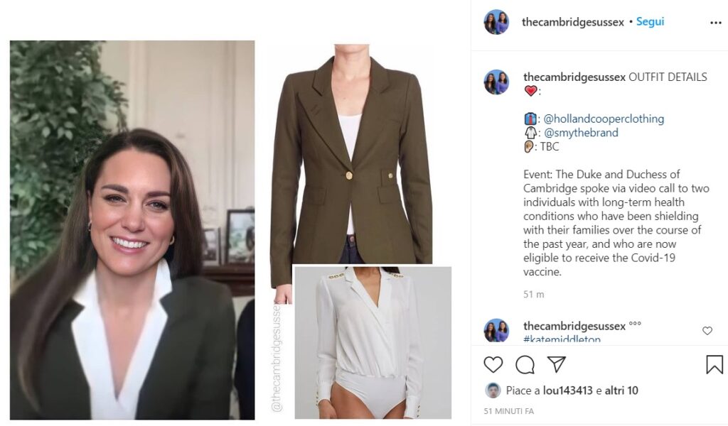 Domenica scorsa, la coppia reale ha parlato su Zoom con alcune persone che sono a rischio e potrebbero presto ricevere la prima dose di vaccino. Per l’occasione, Kate Middleton ha scelto un altro look alla moda che abbiamo potuto ammirare, come sempre, dalla vita in su.