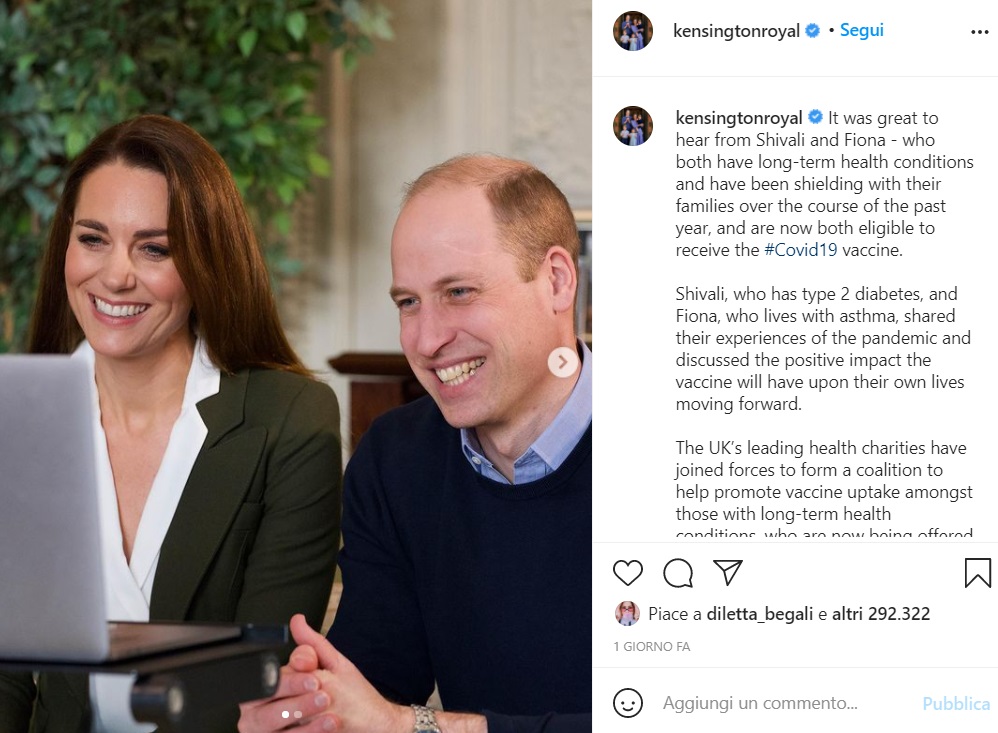 “I social network sono talvolta inondati di voci e disinformazione – ha detto William -. Dobbiamo stare un po’ attenti a chi crediamo e da dove otteniamo le nostre informazioni. Catherine e io non siamo affatto esperti medici, ma sosteniamo con tutto il cuore la vaccinazione: è davvero molto importante”.