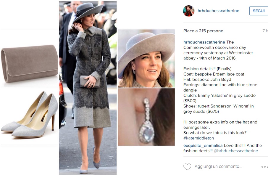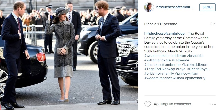 LONDRA – Kate Middleton, cappotto grigio e quell’omaggio a Diana… FOTO. Semplicemente adorabile la Duchessa di Cambridge che, in occasione del Commonwealth Day -la festa che riunisce i 53 Stati del Commonwealth- ha scelto un cappottino sui toni del grigio firmato Erdem che calzava a pennello alla sua figura esile e slanciata. Tra il marito William e il cognato Harry, Kate letteralmente splende. Oltre alle deliziose decoltè ai piedi firmate Rupert Sanderson, vi è un dettaglio che non è sfuggito all’occhio dei più esperti: il cappellino delizioso scelto da Kate infatti -in perfetta sintonia con i colori del cappotto- è stato progettato e disegnato dalla 90enne John Boyd, una delle modelliste preferite della compianta Lady Diana negli anni ’80. Un omaggio -l’ennesimo- della nostra Kate alla mamma del marito William e del cognato Harry e, soprattutto, ad una delle donne più amate dal popolo inglese.