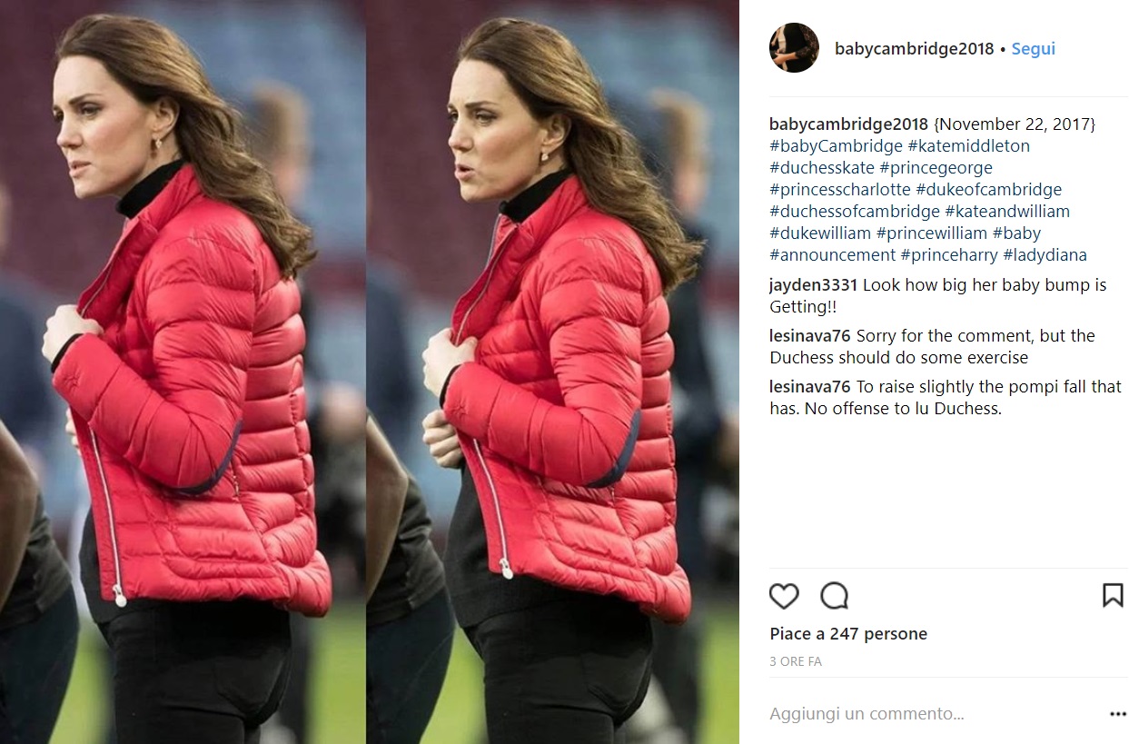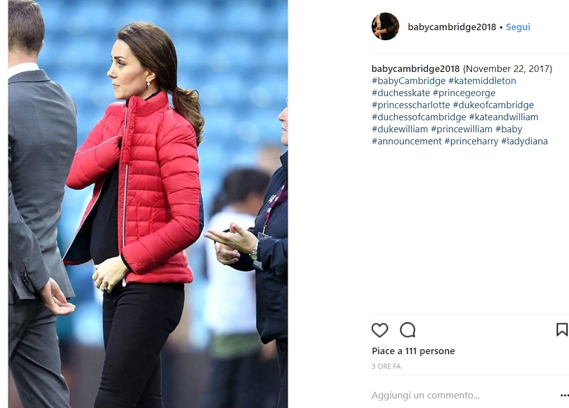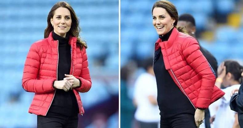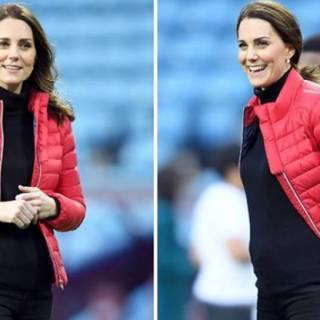 Kate e William hanno fatto visita al campo dell’Aston Villa, squadra ce milita nella serie B inglese di cui il marito di Kate è grande tifoso nonché membro del board amministrativo. Ebbene, Kate ha sfoggiato un look casual che ha finalmente messo in evidenza la sua terza gravidanza, per la gioia dei fan che non vedevano l’ora di scorgere Kate incinta! Piumino rosso, skinny e dolcevita neri, il pancino era piuttosto evidente e Kate non è proprio riuscita a nasconderlo!