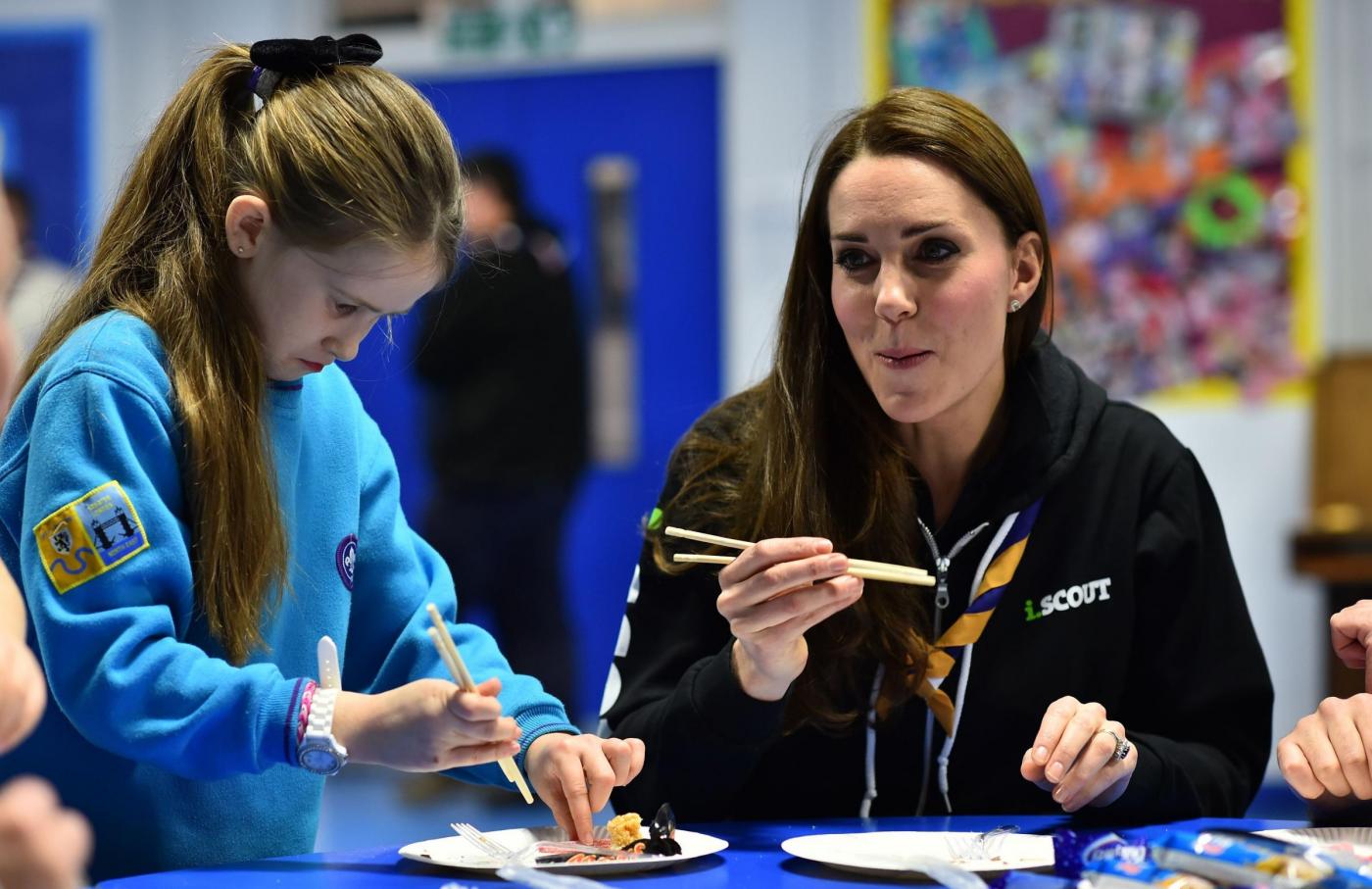 The Duchess of Cambridge teaches a girl how to use chopsticks as she meets with children at the newly established 23rd Poplar Beaver Scout Colony in east London. PRESS ASSOCIATION Photo. Picture date: Tuesday December 16, 2014. Kate’s visit supports the Scout Association's 'Better Prepared' campaign, which aims to help communities to deliver Scouting to two hundred locations across the UK where Scouting can have the biggest impact. Photo credit should read: Ben Stansall/PA Wire
