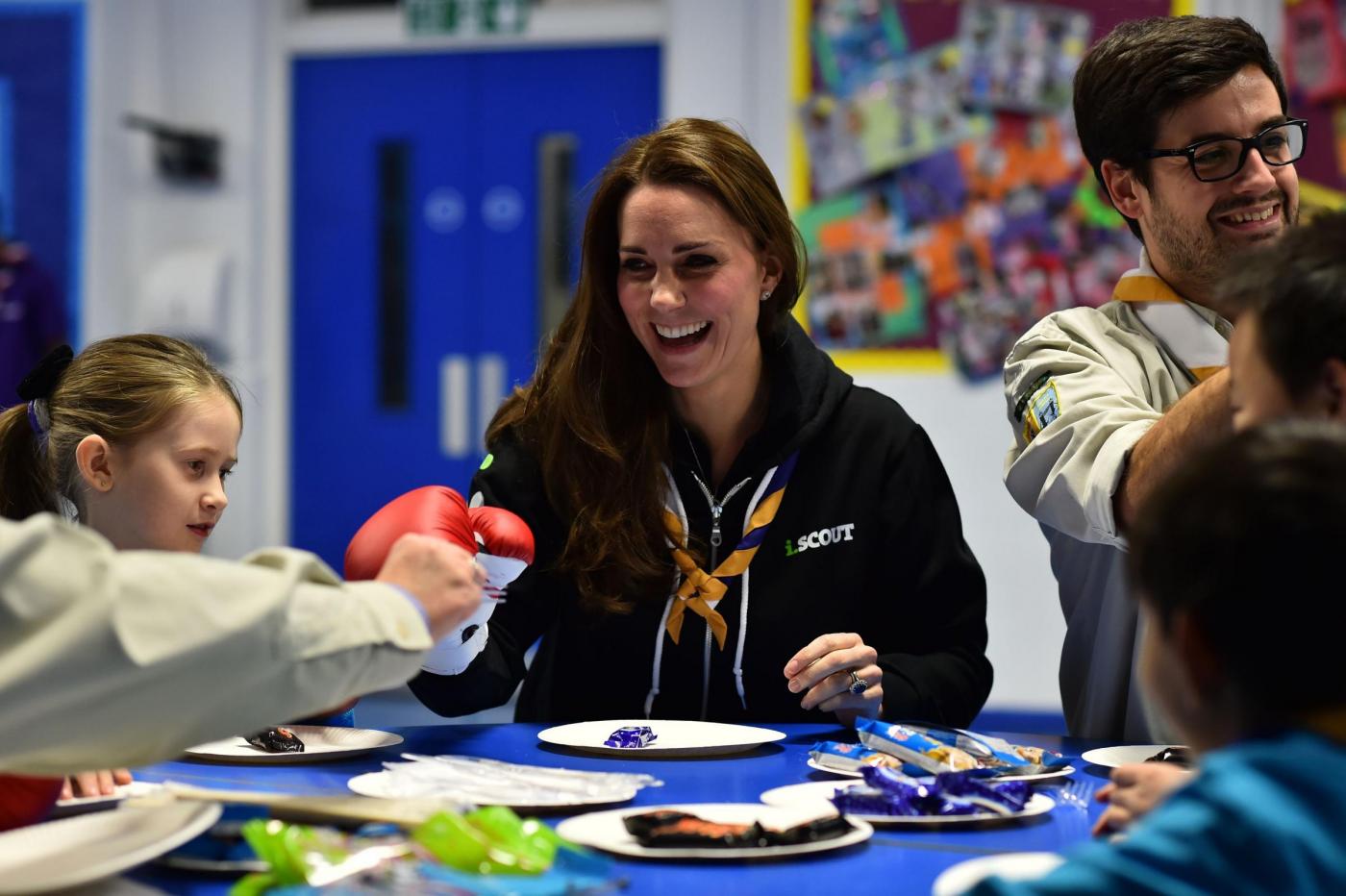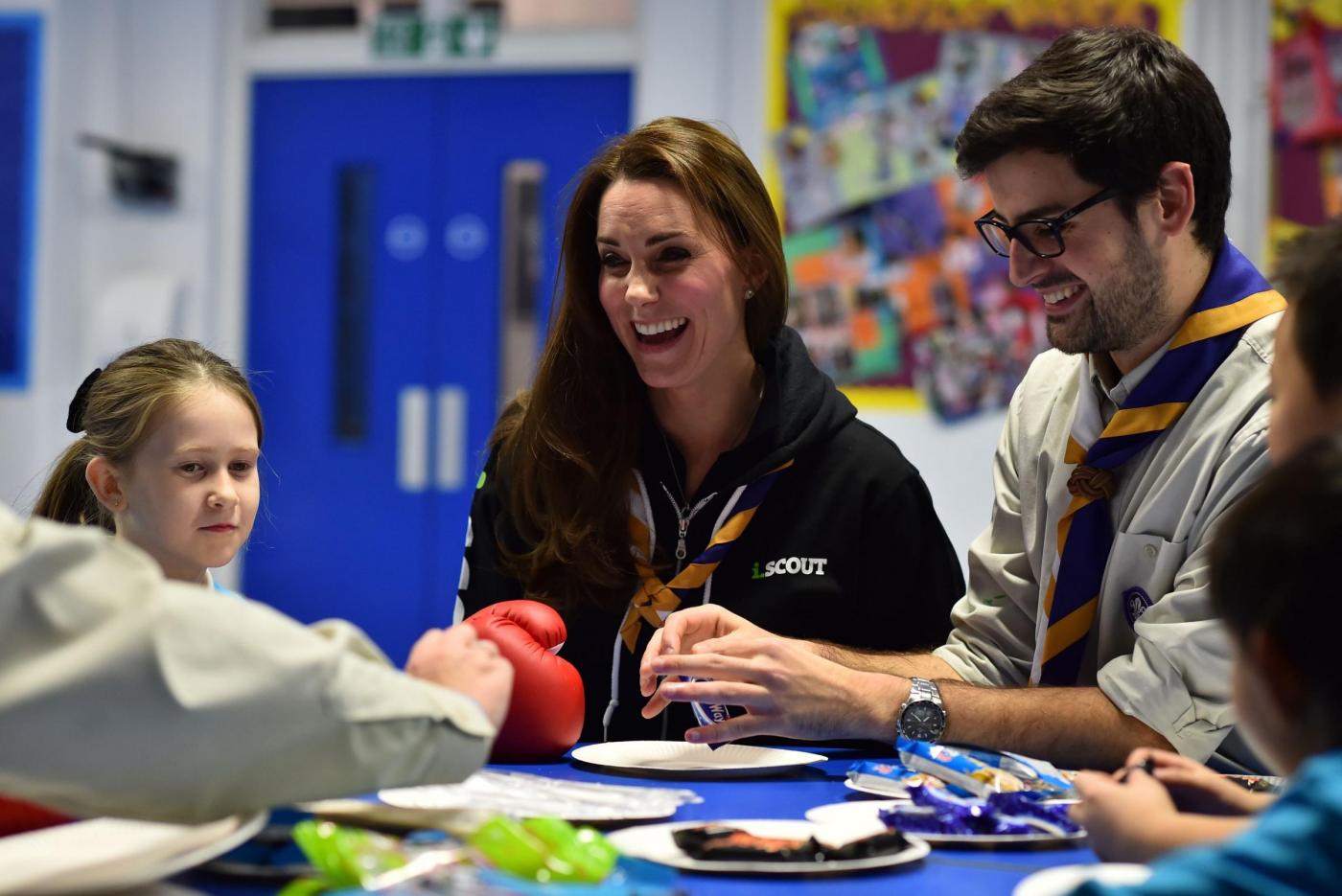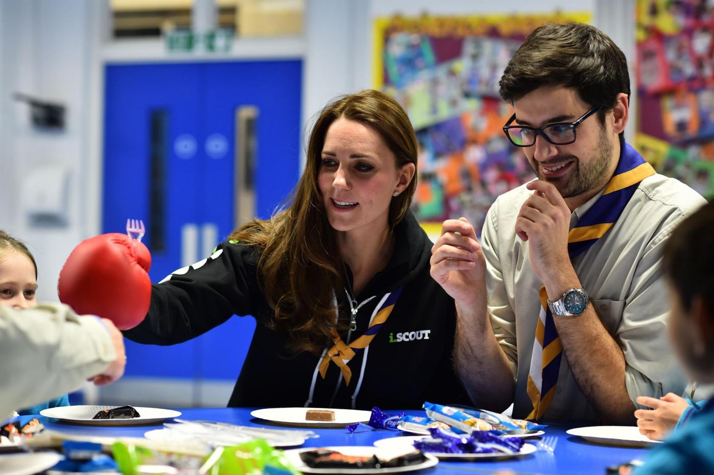 The Duchess of Cambridge sitting beside Scout Leader Carlos Lopez-Plandolit (right), learns about disability by wearing a boxing glove to handle a fork as she meets with children at the newly established 23rd Poplar Beaver Scout Colony in east London. PRESS ASSOCIATION Photo. Picture date: Tuesday December 16, 2014. Kate’s visit supports the Scout Association's 'Better Prepared' campaign, which aims to help communities to deliver Scouting to two hundred locations across the UK where Scouting can have the biggest impact. Photo credit should read: Ben Stansall/PA Wire