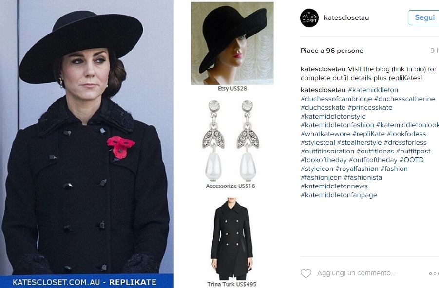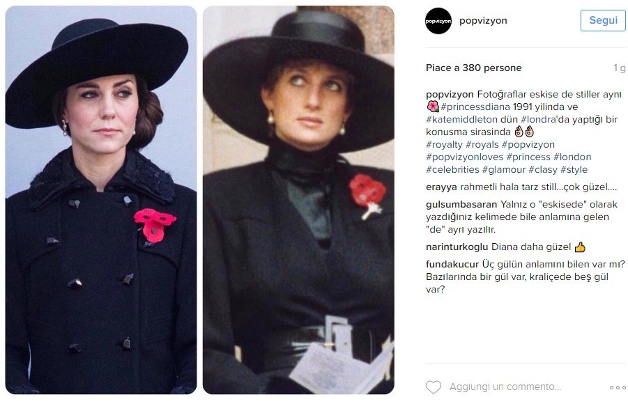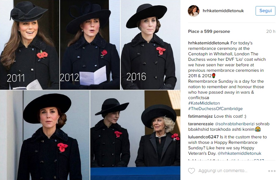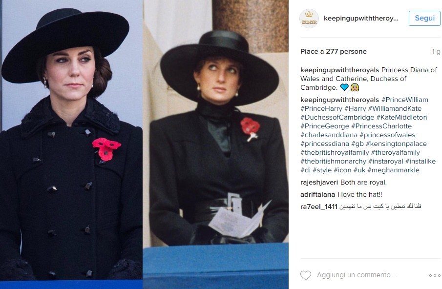 LONDRA – Kate Middleton copia Lady Diana… 25 anni dopo FOTO. Stessa occasione, stesso look… 25 anni dopo. Sembra un omaggio a Lady Diana la mise total black sfoggiata dalla Duchessa di Cambridge in occasione del Remembrance Sunday, il giorno dedicato ai caduti durante la Prima Guerra Mondiale. Cappotto Diane Von Furstemberg e cappello, entrambi neri, sguardo attento e pochi sorrisi: in poche ore le foto di Kate è stata messa a confronto con quella di Lady Diana di 25 anni fa quando nel 1991, sempre in occasione del Remembrance Day , è apparsa con un look total black e il confronto tra le due principesse, molto amate dal popolo inglese, è stato d’obbligo.
