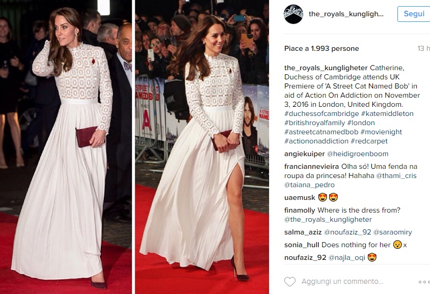 Eppure, sembra che negli ultimi tempi Kate abbia deciso di ribellarsi al protocollo sfoggiando sempre più spesso gonne sopra il ginocchio e abitini con trasparenze e pizzi. Svolta sensuale per la Duchessa che pare stia intraprendendo una vera e propria “battaglia” con la regina per riprendersi il diritto di poter sfoggiare look più giovanili. Basti pensare al completo sfoggiato solo qualche giorno fa in occasione di una visita ad un centro per bambini e adolescenti con difficoltà emotive e comportamentali in Galles, quando si è mostrata con un completo formato da una gonna ben più corta del solito. Ancora, è impossibile dimenticare il red carpet di Kate in occasione della prima del film “A Street Cat Named Bob” a Londra, quando la Duchessa ha scelto un abito che avrà fatto letteralmente impallidire la regina Elisabetta. Si trattava di un vestito lungo firmato Self Portrait con ricami sulla parte superiore ma, soprattutto,un vertiginoso spacco che ha messo in mostra le sue gambe toniche e slanciate.