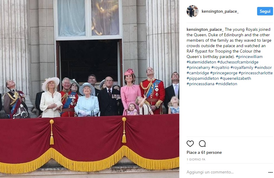 In prima fila infatti spiccava Kate Middleton in un elegante abito rosa acceso firmato Alexander McQueen. Insieme alla Duchessa, in prima linea anche il marito William, i due figli George e Charlotte e la regina Elisabetta accompagnata dal marito il principe Filippo. Dall’altro lato del balcone era ben visibile anche il principe Carlo, accompagnato da Camilla. Ma ad osservare bene le foto, sul balcone sono visibili (poco) anche altri due membri della famiglia reale: le principesse Eugenia e Beatrice. Le due Altezze Reali infatti hanno diritto a stare sul balcone tanto quanto William in quanto nipoti dirette della regina Elisabetta. Eppure, sono state relegate alle file posteriori tanto che è quasi impossibile notarle.