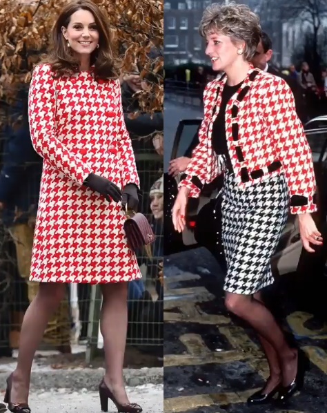 Non è la prima volta che la Duchessa omaggia la mamma di William e Harry con i suoi look o con alcuni accessori. In questo caso, il cappottino scelto per il suo secondo giorno del viaggio in Svezia, è un modello che ricorda moltissimo un altro modello indossato da Lady Diana nel 1990 in occasione del battesimo della Principessa Eugenie nella chiesa di Sandringham. In quel caso si trattava di un completo pied de poule firmato Moschino e composto da gonna e giacchino ed è proprio il giacchino che, in particolar modo, ricorda il cappottino indossato dalla Duchessa poche ore fa.