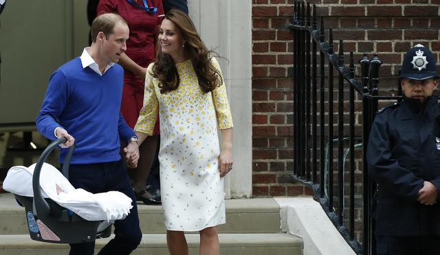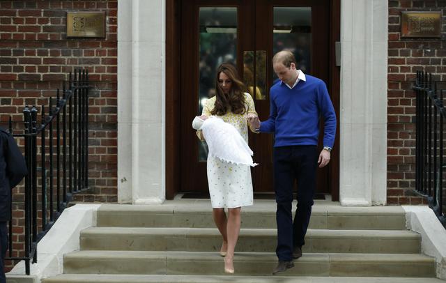 Britain's Prince William, left, and Kate, Duchess of Cambridge, hold their newborn daughter as they leave St. Mary's Hospital's exclusive Lindo Wing, London, Saturday, May 2, 2015. The Duchess gave birth to the Princess on Saturday morning. (ANSA/AP Photo/Alastair Grant)