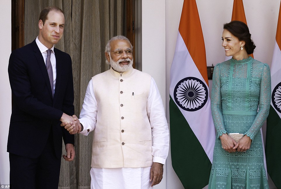 NEW DELHI – Kate Middleton in India sfoggia un vestito da 50 sterline per incontrare i bambini poveri, poi, appena due ore dopo, un abito da 800 sterline per pranzare con il premier indiano Narendra Modi. Il Daily Mail sta seguendo passo per passo il tour in India e Buthan di Kate e William. E non è sfuggita l’accortezza che Kate ha usato nella scelta degli abiti: colori sgargianti, in omaggio all’India, ma tagli più casti per rispettare la sensibilità del Paese dove le donne tengono ben coperte spalle e gambe.