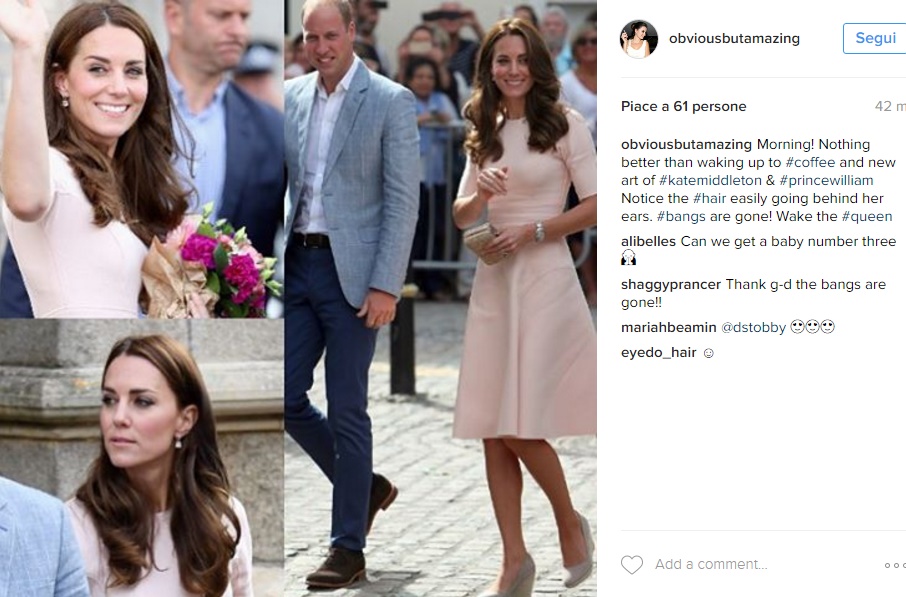 Negli ultimi tempi alcuni segnali avevano fatto sospettare molti siti di gossip che Kate Middleton e William potrebbero aspettare un terzo bebé. Innanzitutto, la scelta di Kate di non presentarsi alle Olimpiadi di Rio per paura di poter contrarre il famigerato Virus Zika, che attacca soprattutto il feto. Poi, ad agosto, la Duchessa è completamente sparita dai radar rifugiandosi nelle campagne del sud della Francia facendo letteralmente perdere traccia di sé. Un atteggiamento che è risultato molto sospetto ai paparazzi. Fino a quel momento, però, erano solo gossip dovuti ad alcuni comportamenti di Kate che assomigliano molto a quelli adottati dalla Duchessa in occasione delle gravidanze di George e Charlotte. Ora però la tesi di una nuova gravidanza sembra essere supportata da una foto apparsa sui giornali di gossip. In occasione della recente visita in Cornovaglia con il marito William, infatti, Kate ha scelto un abitino delizioso rosa confetto firmato Lela Rose che, nonostante gli sforzi della Duchessa, sembra aver tradito il dolce segreto. L’abito, stretto in vita, ha messo in risalto il ventre non proprio piattissimo di Kate. Cosa piuttosto strana per la Duchessa che in genere appare sempre magrissima. I gonfiori, generalmente, non sono contemplati. E invece dalle foto appare un gonfiore sospetto così i fotografi ci hanno messo pochissimo a fare 2 + 2.