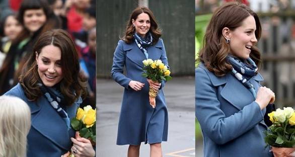 LONDRA – Kate Middleton incinta veste italiano: cappottino super chic FOTO. Cappotto ceruleo firmato Sportmax, marchio italiano del gruppo Max Mara. La Duchessa ama la sartoria di qualità e si vede, non è un caso che SportMax sia uno dei marchi di marchi da lei più amati. In occasione della sua visita alla Roe Green Junior School per un evento di beneficenza in collaborazione con Heads Together, la Duchessa ha riciclato un cappottino celeste SportMax, già indossato in altre occasioni. Scarpe ton sur ton in suade Rupert Sanderson, clutch Stuart Weitzman e sciarpina con stampa floreale Beulah London, già sold out sul sito, completavano il look.