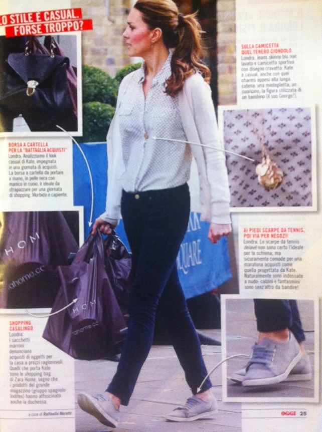 LONDRA – Jeans skinny blu casual, camicetta sportiva con disegno cravatta, sneakers ai piedi e niente meno che un carico di buste del marchio low cost per la casa “Zara Home”. Non è la ragazza della porta accanto che torna a casa dopo un pomeriggio di shopping ma Kate Middleton, Duchessa di Cambridge. moglie del prinicpe William e mamma del futuro erede al trono d’Inghilterra George Alexander.