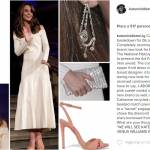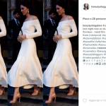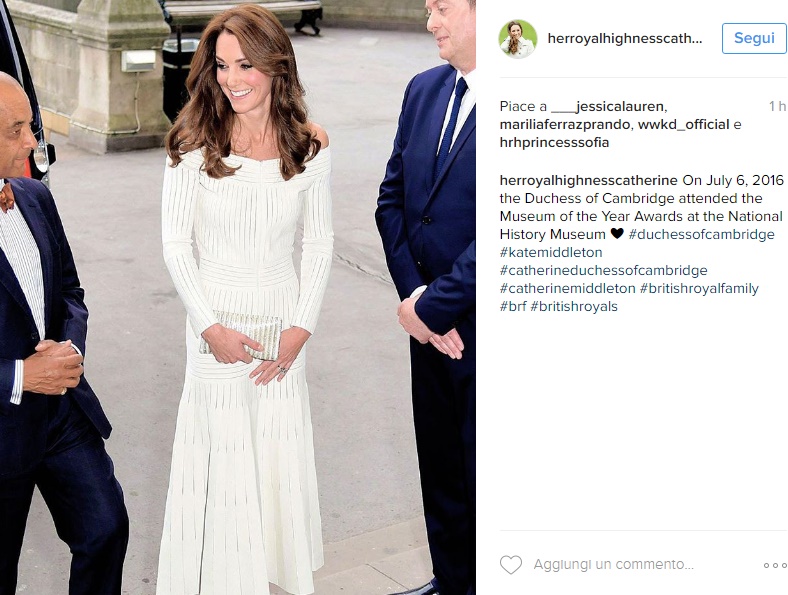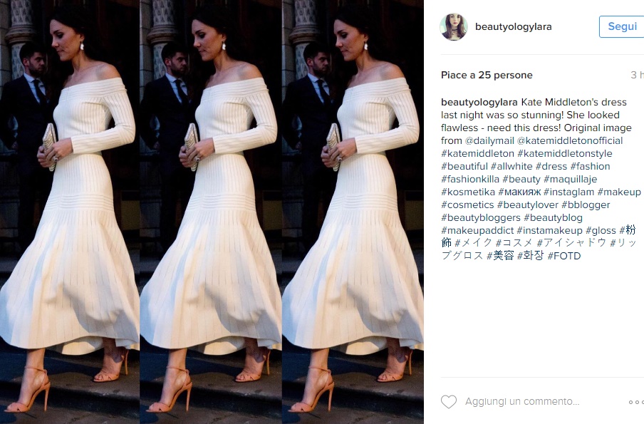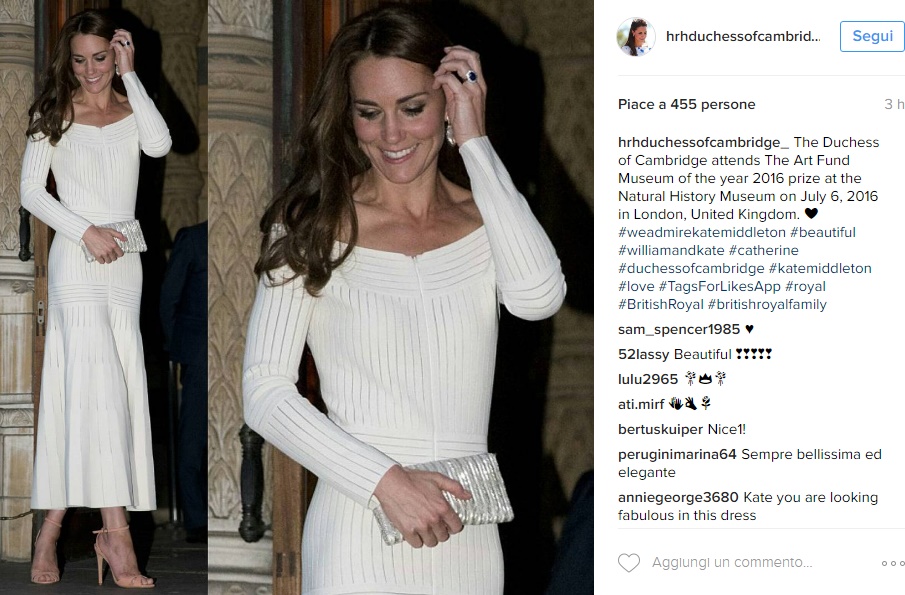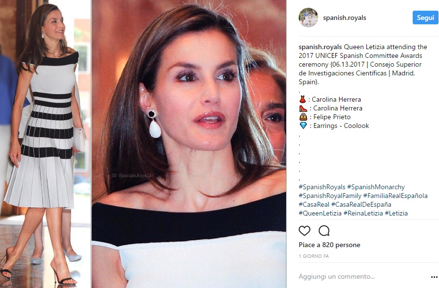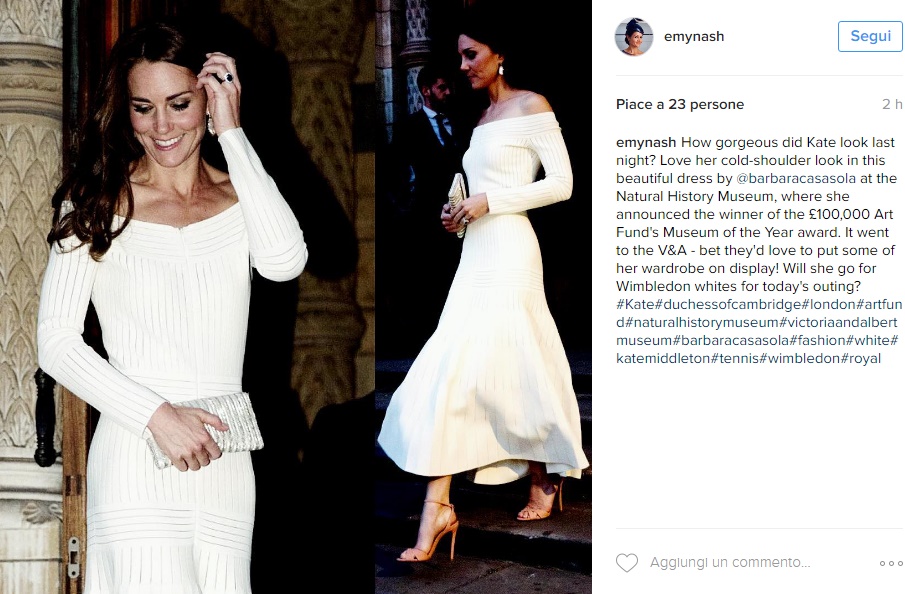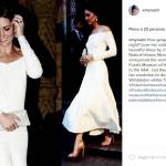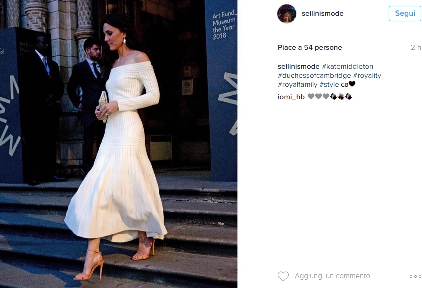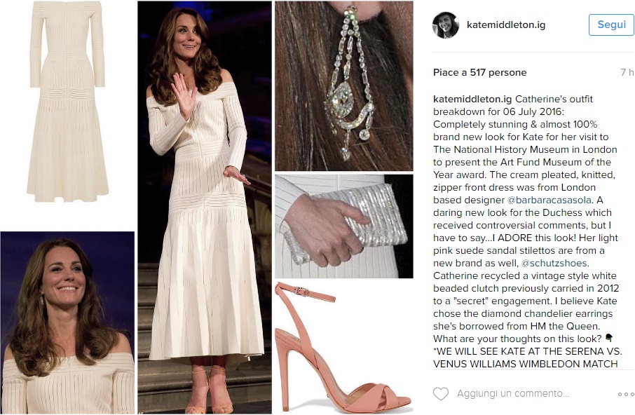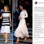 Recentemente Letizia Ortiz ha letteralmente catalizzato l’attenzione dei fotografi grazie ad un look super chic che ha sfoggiato in occasione di una delle sue ultime uscite pubbliche a Madrid. Si trattava di un bellissimo abito firmato Carolina Herrera bianco e nero, con scollo a barchetta, spalline basse e gonna plissettata. Un modello che, tuttavia, ha ricordato moltissimo un altro abito sfoggiato da Kate Middleton a luglio 2016 quando, in occasione della cena di gala che ha avuto luogo al Museo di Storia Naturale di Londra, ha sfoggiato una meravigliosa creazione di Barbara Casasola. Un abito bianco dal valore di 1.105 sterline che lasciava scoperte le spalle e che si adagiava delicatamente sul corpo filiforme di Kate. Tocco glamour, i sandali neutri con tacco modello “Dollie” del marchio Schutz , una scarpa assolutamente inedita per la Duchessa che in genere predilige la classica decolletè.