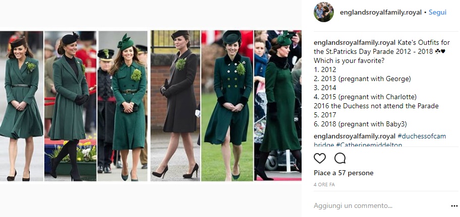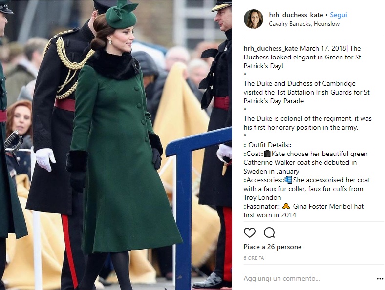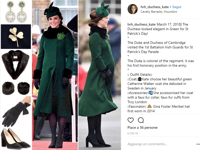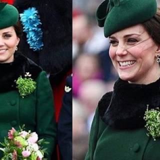 Per l’occasione la Duchessa ha scelto il verde, colore simbolo di San Patrizio. Kate ha sfoggiato un cappottino (riciclato) firmato Catherine Walker a cui ha aggiunto un collo di pelliccia (sintetico, chiaramente!) e scarpe con tacco largo firmate Tod’s, uno dei modelli più comodi tra tutte le scarpe della Duchessa. Dopotutto ormai il pancione è piuttosto evidente e, nonostante sia incredibile come Kate sembra non aver preso nemmeno un chilo in più, la gravidanza (con annessa ritenzione idrica) si fa sicuramente sentire su gambe e caviglie. Il cappottino, elegante e chic, è stato già sfoggiato dalla Duchessa poche settimane fa in occasione del suo tour istituzionale in Svezia e Norvegia.