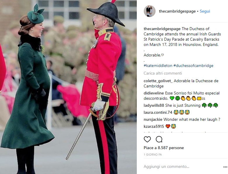 Durante la parata come da tradizione Kate ha ricevuto un cesto di trifogli da distribuire. Poi ha avuto anche modo di accarezzare Domnhall, il cagnolone che da sei anni è la mascotte delle guardie e della parata. Al momento del brindisi, poi, mentre William si è concesso una birra (come da tradizione inglese) Kate ha dovuto rinunciare brindando solo con un po’ di acqua frizzante.