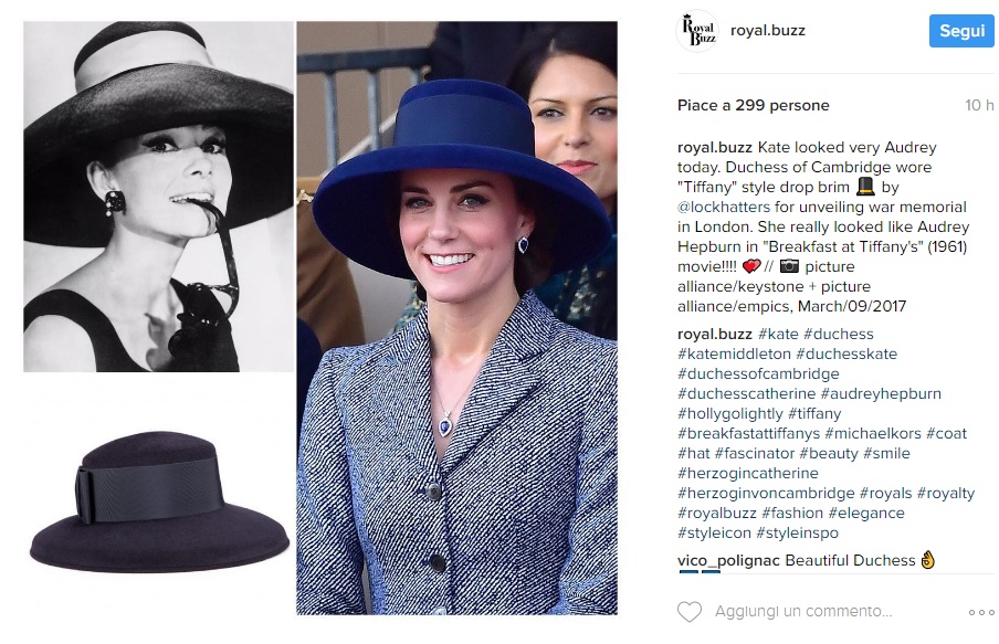 ROMA – Kate Middleton look: cappotto riciclato e omaggio a… FOTO. Elegante e chic: come sempre Kate Middleton non sbaglia un colpo in fatto di look e, in occasione dell’omaggio di tutta la famiglia reale agli eroi britannici delle guerre in Iraq e Afghanistan, ha sfoggiato una mise che ha catalizzato l’attenzione di pubblico e fotografi. La Duchessa ha scelto un cappottino sui toni del blu firmato Michael Kors, scarpe con tacco in suade Rupert Sanderson e clutch Russell & Bromley. Ad attirare l’attenzione, però, è stato un accessorio in particolare: il cappello firmato Lock & Co. dal sapore vintage che è sembrato un vero e proprio omaggio all’attrice che più di tutte è l’emblema della classe e dell’eleganza: Audrey Hepburn. Kate Middleton è da sempre considerata icona di moda e dunque non è poi cosi singolare che si sia ispirata all’indimenticabile Holly Golightly di Colazione da Tiffany per uno dei suoi look.